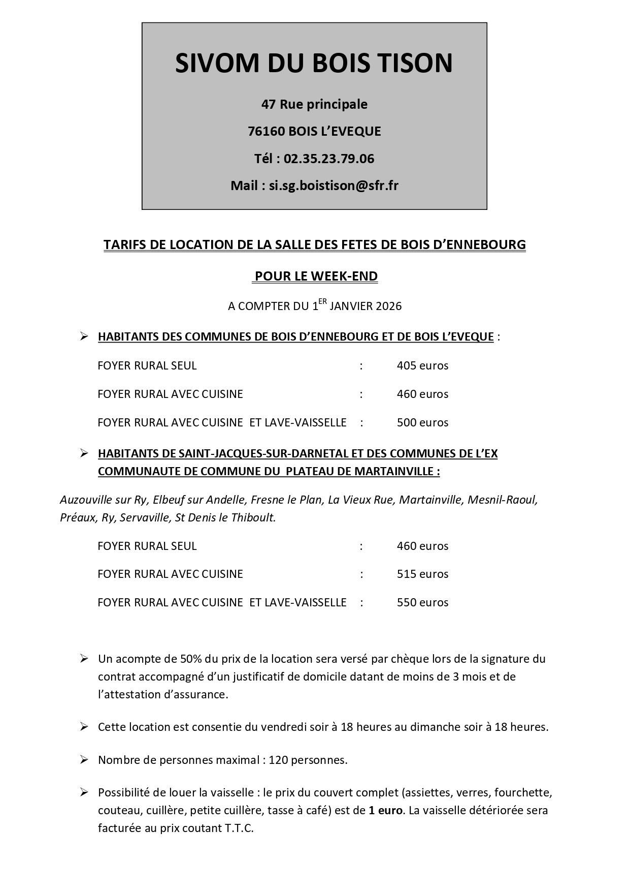 Location de salleInformations pratiques15 décembre 202519 février 2026 > Le Foyer Rural de Bois d’Ennebourg est géré par le SIVOM Du Bois Tison >Télécharger le règlement précédentRemise des Colis de Noël 2025suivantComptages nocturnes 2026
